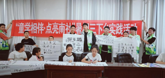 图为实践团队人员教孩子写书法 庞子健 供图
