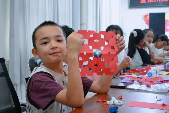 活动尾声,孩子们举着各自的作品笑靥如花:有的剪出了富有童真的爱心,有的裁出绽放的花朵,还有的将维吾尔族特色花纹融入红纸之上,是童心与匠心的共舞,是民族文化的交响。