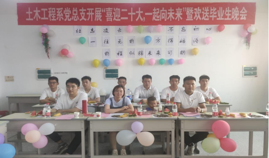 为进一步加强基层党组织建设,同时表达对毕业生的美好祝福,丰富校园文化生活。6月5日晚,土木工程系党总支在工科实训楼南513开展“喜迎二十大,一起向未来”暨毕业生欢送会,土木工程系党总支书记王荣、学生第一党支部书记孟旭波、学生第一党支部副书记刘雨涵及学生代表参加。