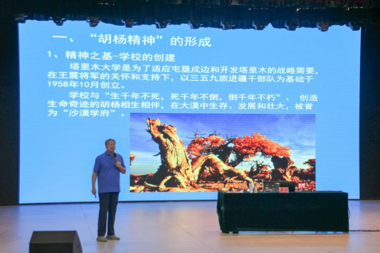 授课中,原校长将胡杨精神置于屯垦戍边的宏大叙事中展开:从新疆和平解放的号角声中知识青年奔赴边疆,到改革开放的春风里塔大学子扎根大漠,新时代征程上,青年学子用脚步丈量边疆土地……一代又一代塔大人坚守大漠,他们接力传承的,不仅是“艰苦奋斗、自强不息”的拼搏精神,更是“边疆发展我担当”的家国情怀。这精神如同一束强光,穿透岁月尘埃——它是培养“下得去、留得住、用得上”边疆建设者的价值灯塔,是铸牢中华民族共同体意识的情感纽带,更是为稳疆兴疆大业输送“胡杨般坚韧”人才的动力引擎。