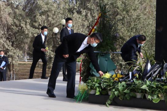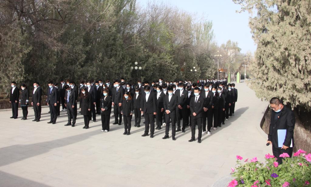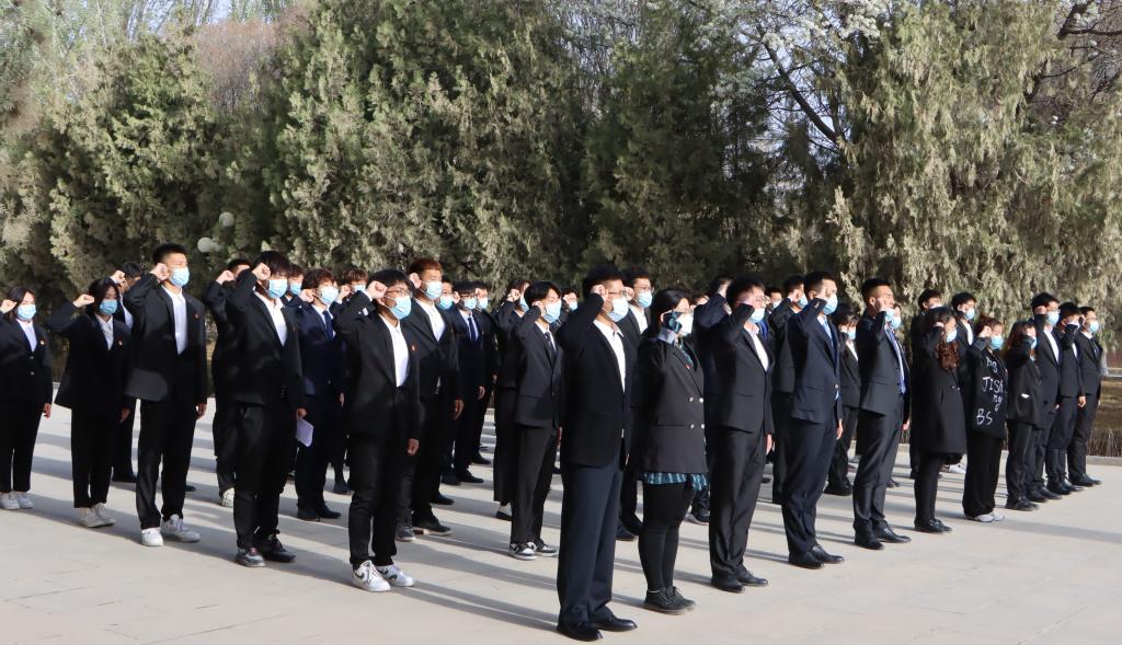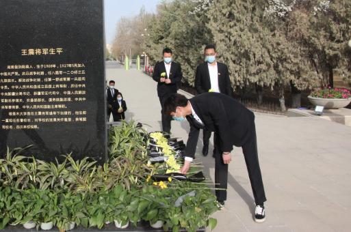 上午10时整,伴随着音乐响起,仪式正式开始,全场奏唱中华人民共和国国歌。李同玺带领全体成员回顾王震将军的生平事迹,追忆王震将军一生赤诚爱国,致力于新疆屯垦戍边、生产发展的伟大事业。全体人员伫立在王震将军像前,集体默哀并宣誓。春风送花表哀思,青松滴雾寄深情。《献花曲》响起,师生代表拾级而上,将手中的鲜花摆放在铜像面前,驻足凝视、缓步绕行、寄托哀思。
