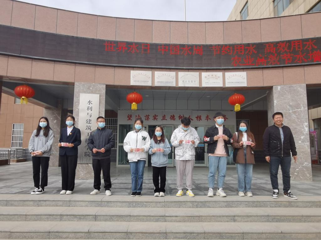 3月22日,团队成员组织学生,在综合楼及2号教学楼门口,发放中国水利学会“世界水日·中国水周”科普活动宣传册,向广大师生宣传“护好大水,喝好小水”的科普知识12问,普及水资源各个方面的相关知识。在网上发起“世界水日·中国水周”及“护好大水,喝好小水”知识竞赛,共收到229份有效答卷,产生一等奖1名,二等奖3名,三等奖8名,由团队成员李林为获奖同学发奖。26日,团队成员在管瑶老师的带领下,组织学生在工科实训楼进行高效用水,节约用水宣讲活动。通过宣讲,让同学们树立起“节水优先,空间均衡,系统治理,两手发力“的新时代治水理念,在以后的学习、工作过程中,将节水意识和保护水资源落到实处。