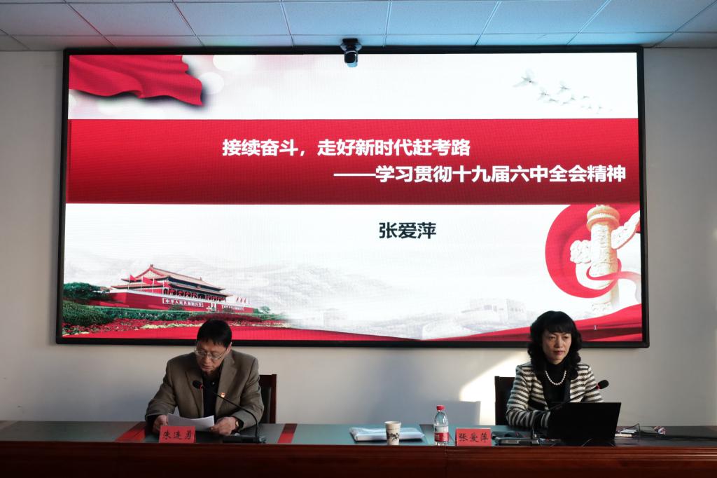 2021年12月15日下午,学校学习贯彻党的十九届六中全会精神宣讲团成员、校党委副书记张爱萍同志在工科实训楼一号会议室作宣讲报告。活动由学院党委书记朱连勇主持,参加宣讲会的有信息工程学院领导、同仁,学院党委班子成员、全体中层干部、党支部书记、师生党员代表共60人。