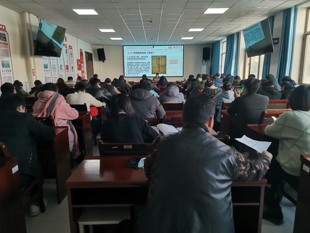 2021年12月22日下午,学院学习贯彻党的十九届六中全会精神宣讲团成员、学院党委书记朱连勇同志在工科实训楼一号会议室作宣讲报告。参加宣讲会的有学院党委班子成员、全体中层干部、党支部书记、师生党员代表共60人。