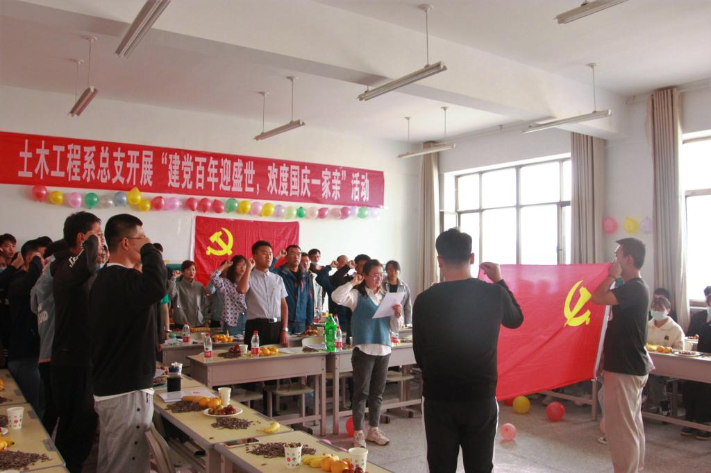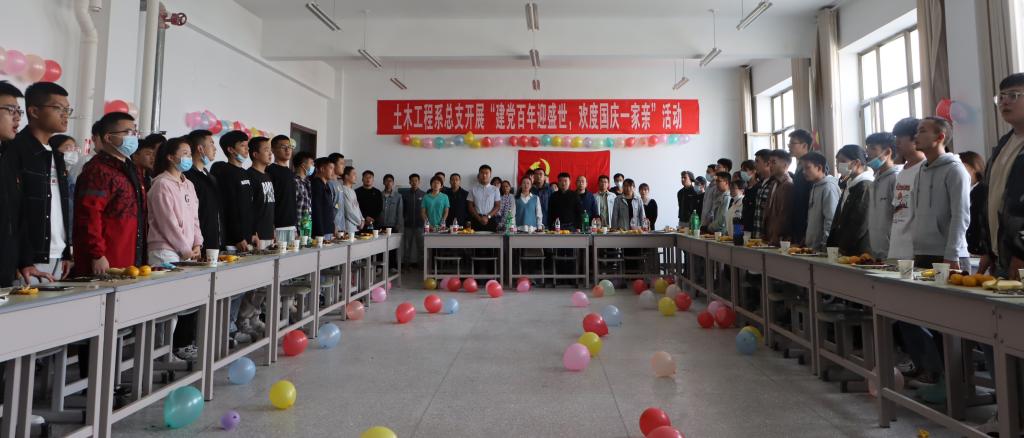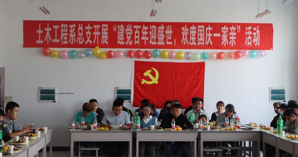 在建党百年华诞之际,土木工程系党总支于10月6日下午18:00在工科实训楼南513开展“建党百年迎盛世,欢度国庆一家亲”活动,土木工程系党总支书记王荣、土木工程系副主任杨晓松、土木系教师代表、学生代表参加,活动由土木工程系学生第一党支部书记孟旭波主持。