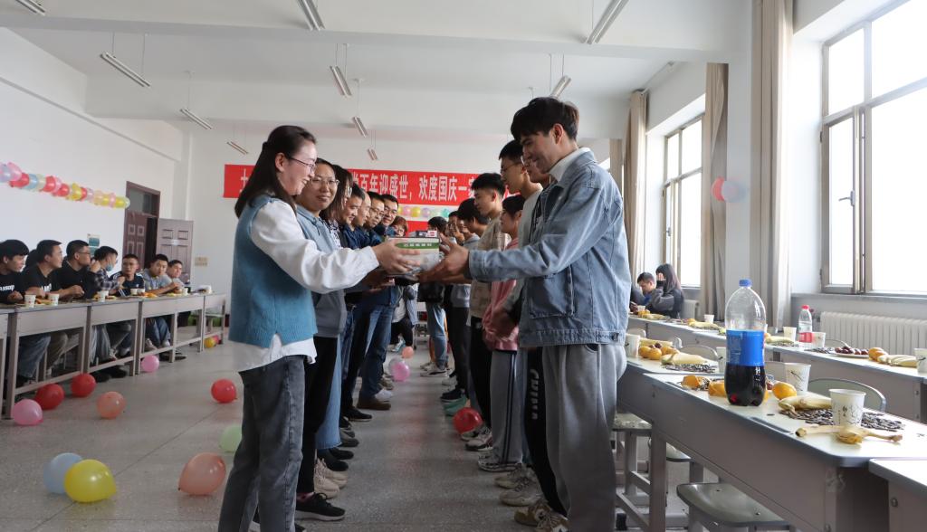 活动中老师们为学生发放礼品。“百年正是奋斗时,启航再创新征程,再次感谢学校对我的照顾,我要努力学习科学文化知识,团结各民族同学,积极参加比赛活动,为学院和学校争光,永远铁心跟党走,做新时代胡杨青年。”给排水科学与工程专业2019级1班的艾力扎提同学说。