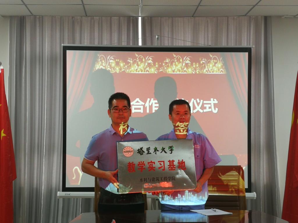 与阿拉尔艾特克水务有限公司校企合作协议》,王兴鹏给企业颁发教学实习基地牌匾。