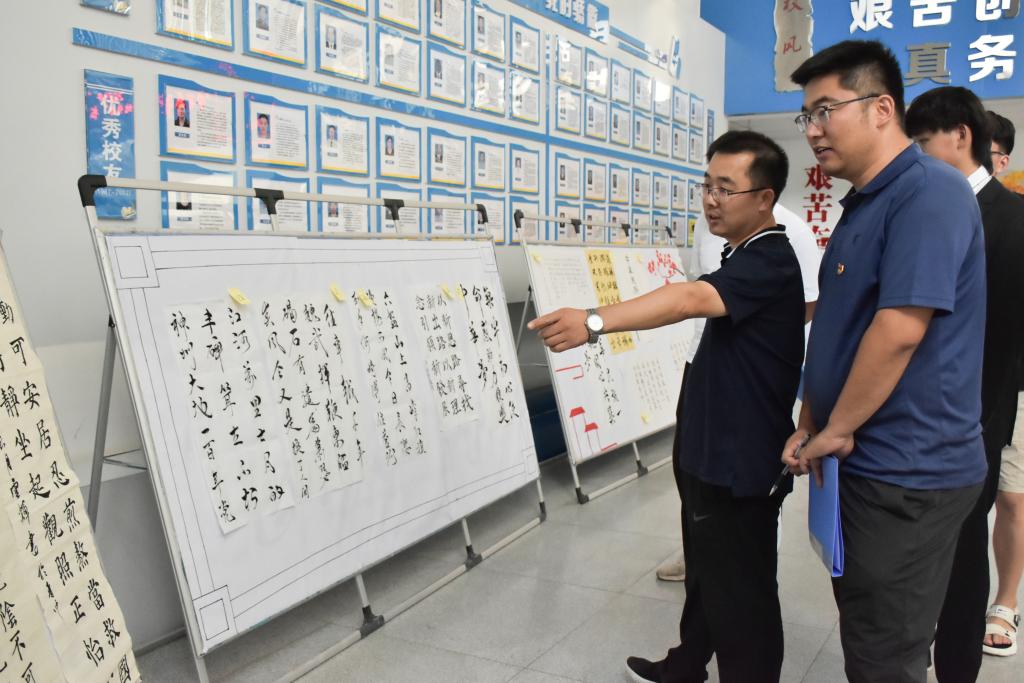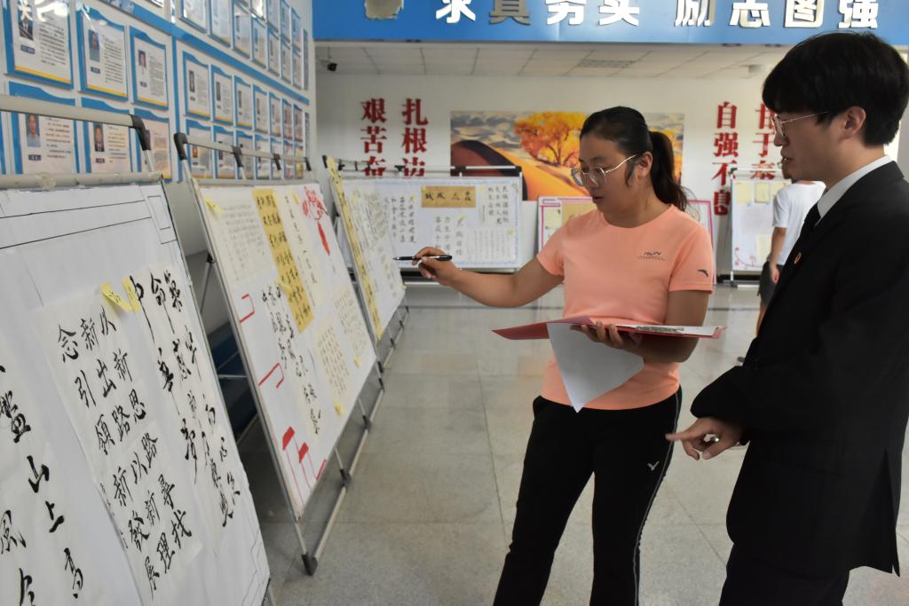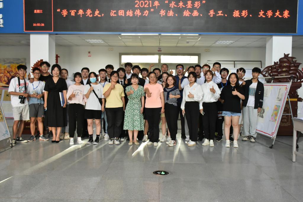 在工科实训楼一楼大厅举行水木墨影-“学百年党史,汇团结伟力”主题文学、书法、绘画、手工、摄影作品展活动。学院党委副书记李新、学生办公室主任王小云、团委副书记李同玺、部分辅导员及学生干部代表现场观看作品展并对各类作品进行打分。