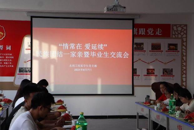 水利工程系学生党支部于2021年6月10日在学院党团校举行了“情常在 爱延续”民族团结一家亲暨毕业生交流会。水利工程系党总支书记李林、水利工程系学生党支部书记王小云、水利工程系全体党员及在校生代表参加了活动。