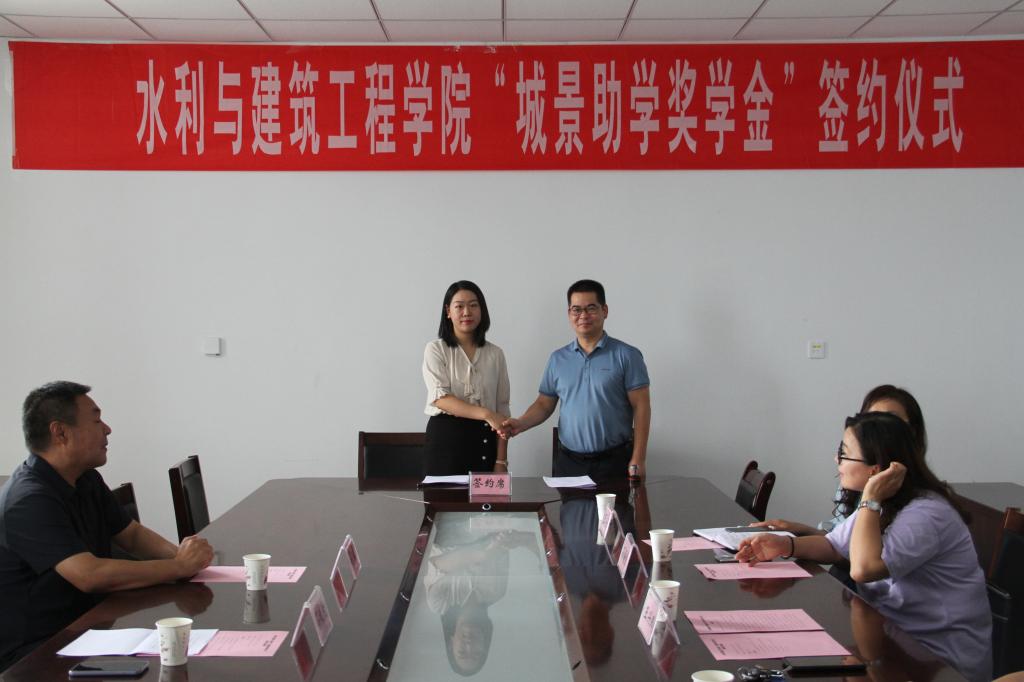 王兴鹏代表学院党委和贫困学子对城景公司捐资助学表示感谢。他指出,学院的发展离不开社会各界的帮助,将城景等具有优秀企业文化和现代企业管理理念的公司引入校园,促进学生成长成才也希望未来双方在人才培养与吸纳、校企合作与发展、校外实习基地建设等领域加强合作与交流。最后王兴鹏与石晓尧签订协议,并合影留恋。