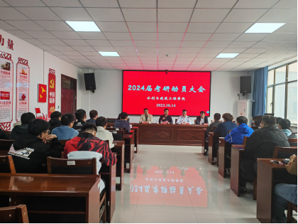 于10月14日在工科楼一号会议室开展2024年考研动员大会。学院党委副书记、院长王兴鹏教授,副院长杨保存教授,副院长、水利工程学科带头人孙三民教授,土木工程学科带头人王成教授出席会议,研究生代表辛朗、刘世元以及全院本科生代表参会,会议由副院长杨保存主持。