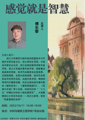 浙江大学建筑与城市规划联盟美术与环境艺术研究室主任傅东黎老师围绕“感觉就是智慧”展开精彩演讲,并在美感和审美的基础上,对建筑的艺术创作与大家分享,同时播放傅老师的建筑美术作品,作品惟妙惟肖,雕梁画栋,独具匠心,让师生们享受到了视觉的盛宴。傅东黎老师表示,在参与“对口支援五楼自拍