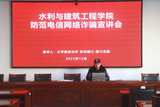 教职工的反恐反诈安全意识,着力提升学院安全防范水平。12月6日下午,学院邀请大学路派出所在工科实训大楼一号会议室开展了主题为“加强反恐反诈宣传,共筑校园安全防线”的现场宣传活动,由大学路派出所副所长买买提江·要力瓦斯、民警谭川林主讲,水建院全体教职工参加。