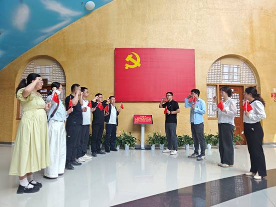 参观结束后,全体党员教师整齐列队,面向鲜红的党旗,庄严地举起右拳,重温入党誓词。“我志愿加入中国共产党…… 随时准备为党和人民牺牲一切,永不叛党。”铿锵有力的誓言在纪念馆前回荡,这不仅是对入党初心的回顾,更是对肩负使命的庄严承诺,进一步坚定了党员教师们为党的教育事业不懈奋斗的决心。