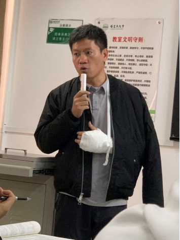 11月18日清晨,在医院病床前,补建伟同志强忍伤痛,用右手仔细修改课件、标注教学重点。中午,他不顾医生劝阻,毅然办理出院手续,提前赶往学校准备下午的课程。课堂上,他全程站立授课,用右手流畅地板书,将精心准备的教学内容娓娓道来。从理论阐释到案例分析,他用扎实的专业功底和饱满的教学热情,确保了教学质量,赢得学生由衷敬佩。