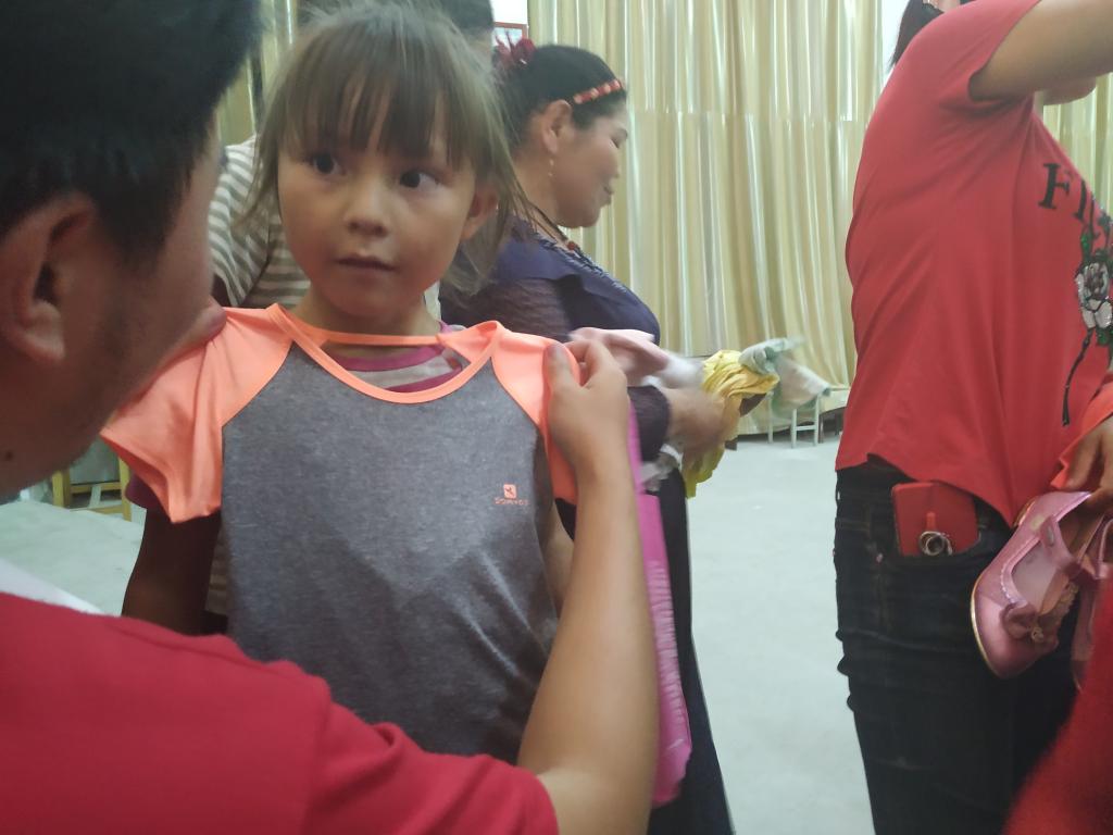歌舞活动之后,实践队举行了爱心物资的捐赠。小孩子们纷纷拉着大人前来领取,实践队的队员们也忙着帮小朋友试选衣服。看到小朋友们拿到自己喜欢衣服,露出快乐的笑脸,孩童纯真笑容的样子感染着在场的每一个人。