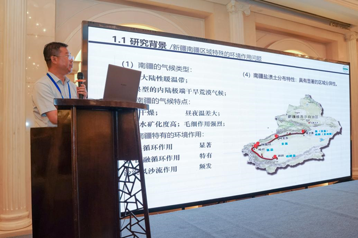在严酷环境隧道工程建设分会场,杨保存教授作了题为《荒漠盐渍土环境耦合作用道路结构损伤机理与防灾控制研究》的专题报告。报告主要介绍了新疆南疆区域特殊的环境作用问题及引发道路工程灾害的科学问题,着重介绍了运用团队自主研发的荒漠盐渍土环境“水-盐-温多场耦合试验系统”开展道路结构损伤机理相关研究工作,针对南疆盐渍土环境道路工程盐胀-冻胀灾害问题提出了道路结构防灾设计方案与灾害控制方法。