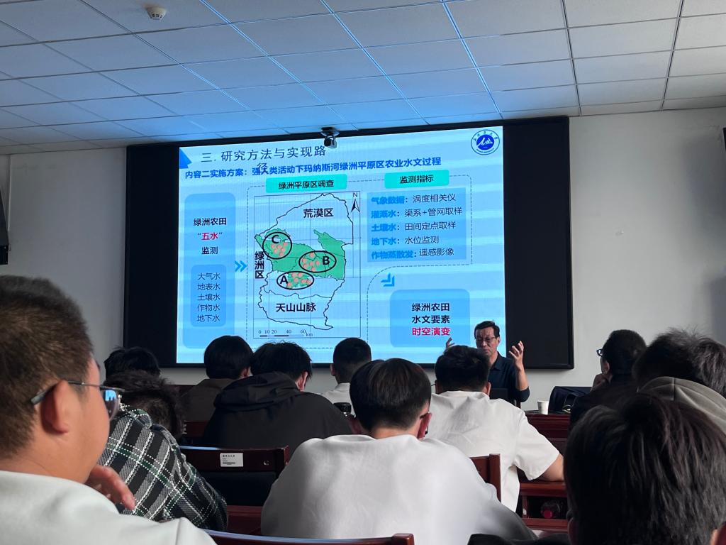 在此次报告中,何新林教授围绕当前新疆气候环境变化带来的挑战与水资源高效利用方面的难题,结合国际节水技术现状及趋势,为师生系统介绍了他们课题组近年来在水资源多维协同演算、模拟、集成、供给、平衡领域的重要研究进展。着重介绍了产汇流机理与径流模拟、地下水-土壤水-作物水-大气水作用机理、植被水分利用来源、地下水水位阈值与生态需水量确定和水分运移模型尺度转换与融合方面的研究方法和未来发展方向。何新林教授表示,新疆节水理论与技术领域的研究大有可为,并鼓励大家立足新疆特色节水难题做科研。
